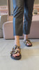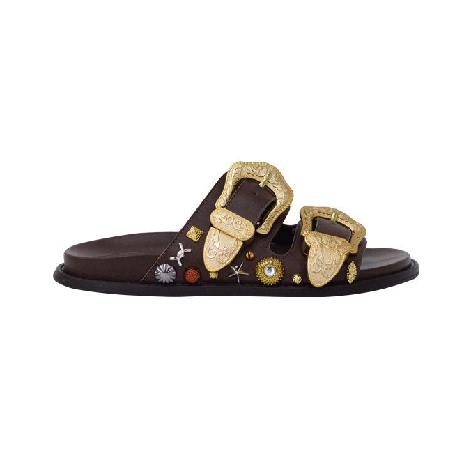 A Raika é aquela papete de impacto que transforma o look sem esforço: toda em couro, inclusive a palmilha, ela vem com duas tiras largas e maxi fivelas trabalhadas, com desenho ornamentado que puxa para o mood western chic. Na lateral, o charme fica por conta do mix de aplicações com efeito joia (medalhas, estrelas e pontos metalizados), criando textura e brilho na medida certa, daqueles que funcionam tanto de dia quanto à noite. O solado baixo e a palmilha macia deixam a pisada mais confortável para acompanhar rotina, viagem, almoço, shopping ou um happy hour, enquanto o visual “statement” entrega a mesma pegada de passarela que a gente vê em referências como Isabel Marant e Chloé (boho com western), além do clima de fivelas marcantes que aparece em coleções de Gucci e Saint Laurent. Para combinar: fica perfeita com jeans reto ou wide leg e camiseta branca, alfaiataria leve (colete + bermuda), vestido midi fluido, saia jeans, conjunto de linho, ou até um vestido mais minimalista para deixar o calçado ser o protagonista.