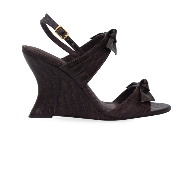 A Sandália Bethania traz aquele impacto imediato de design com o salto anabela escultural de 9 cm, que desenha uma silhueta moderna e ainda entrega mais estabilidade para caminhar do que os saltos finos tradicionais. O modelo tem bico aberto e duas tiras mais largas no peito do pé, cada uma finalizada com laço aplicado, criando um contraste super elegante entre presença e delicadeza; em algumas versões o acabamento aparece com textura marcada tipo croco e em outras mais liso/metalizado, sempre com cara de peça de grife. A tira traseira com fivela regulável ajuda a ajustar no calce e manter o pé firme, e como ela é toda em couro inclusive a palmilha, o toque e a estrutura ficam mais premium para usar por horas. Fica perfeita com alfaiataria (calça reta, pantalona ou bermuda de corte), vestidos midi fluidos, saia acetinada, jeans mais reto com camisa ou até um look minimalista monocromático, e funciona lindo para eventos, jantar, trabalho em dias de reunião e festas onde você quer conforto sem perder o efeito “uau”. Essa combinação de laços + salto escultural conversa direto com o que marcas como Valentino e Miu Miu vêm puxando no lado romântico, enquanto o volume do salto entra na mesma energia das formas escultóricas que aparecem nas coleções de Bottega Veneta e Jacquemus.
