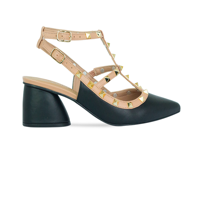 O modelo Mona Low aposta em um visual cheio de personalidade sem abrir mão do conforto. Com salto de 5 cm em formato bloco levemente abaulado, ele garante estabilidade e estilo para o dia a dia. O cabedal de bico fino é cruzado por tiras duplas com aplicações de pirâmides no mesmo tom do sapato, criando um efeito monocromático sofisticado e ao mesmo tempo moderno. A fivela lateral regula o ajuste, enquanto o design aberto no calcanhar traz leveza à composição. Essa proposta remete aos modelos icônicos da Valentino, que seguem firmes entre os favoritos das fashionistas.