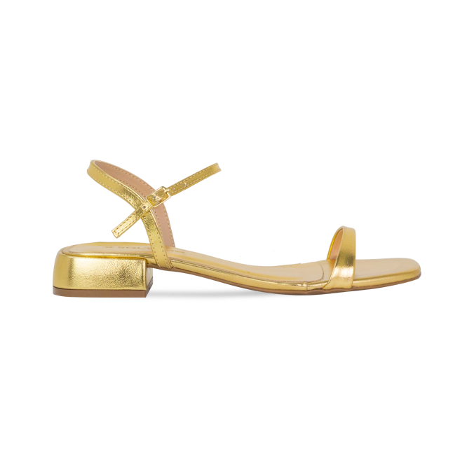 Sandália Regina Dourado com salto baixo e acabamento em verniz
