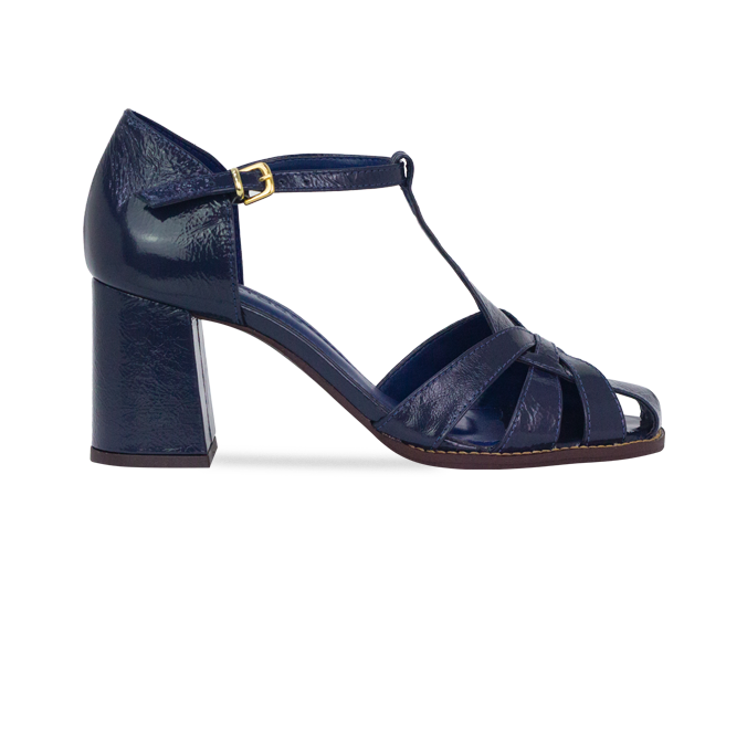Sandálias Yolanda Azul: O Brilho do Verniz com o Conforto do Salto 7cm