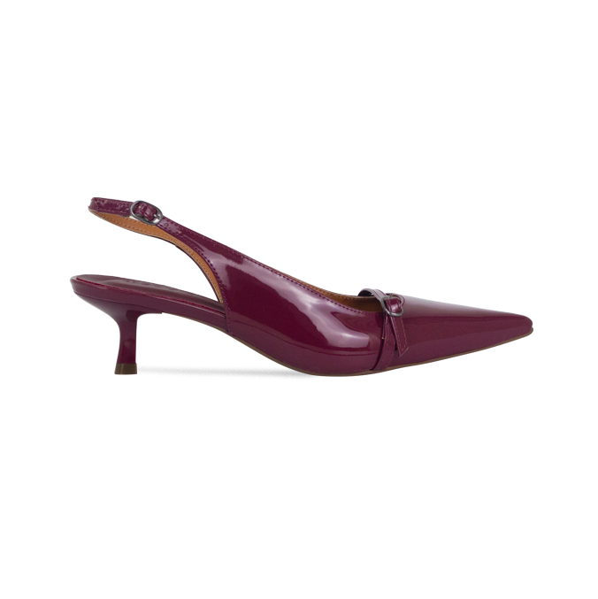 O modelo Carol, com acabamento em verniz e salto de 5 cm, traz uma leitura sofisticada do scarpin slingback. A tira com fivela na frente dá aquele charme discreto e atual, perfeito pra quem quer um calçado que une elegância e praticidade. Vai bem com calças de alfaiataria, saias midi e até jeans reto com blazer. Referência de estilo? Loewe e Prada têm apostado forte no verniz como ponto de brilho nos looks da estação.