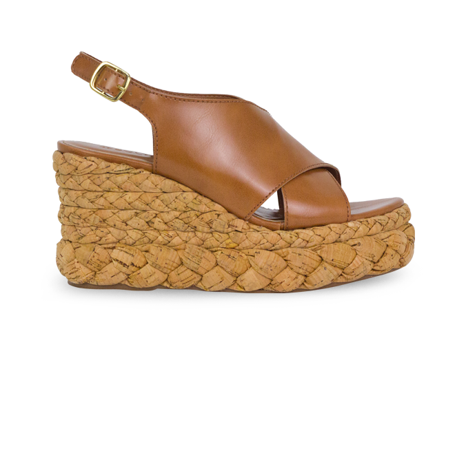 A Sandália May é aquela peça que traz estilo e conforto em dose máxima. Com salto anabela de 9 cm, ela se destaca pela forração artesanal em cortiça tramada, um detalhe sofisticado que adiciona textura e um toque natural ao design. O cabedal em tom caramelo com tiras largas cruzadas na parte frontal garante um visual moderno e elegante, além de ótimo ajuste ao pé. A tira traseira com fivela lateral proporciona praticidade no calce e segurança ao caminhar.