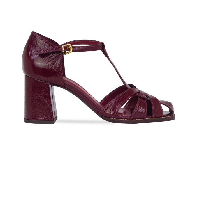 Sandálias Yolanda Vinho: O Brilho do Verniz com o Conforto do Salto 7cm
