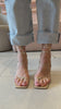 A sandália Valquíria com salto de 8 cm tem aquele visual leve e marcante na medida certa: ela vem com bico quadrado moderno, tira de dedo e tiras delicadas que cruzam o peito do pé com detalhe de nozinho, criando um desenho leve que deixa o pé em evidência sem pesar no look. A amarração longa no tornozelo permite ajustar do seu jeito (dá pra dar voltas mais altas ou mais baixas), trazendo firmeza ao caminhar e aquele ar de passarela que a gente vê em propostas minimalistas de grifes como The Row e Saint Laurent, com a pegada lace-up que Aquazzura ama e o toque arquitetônico que lembra Jacquemus. Vai fácil do jantar ao evento: fica perfeita com vestido slip, saia midi acetinada, alfaiataria com blazer e calça reta; e, na onda das tendências, os shapes clean de tiras ultrafinas e o bico quadrado seguem fortes, principalmente em versões neutras e metalizadas que combinam com tudo.