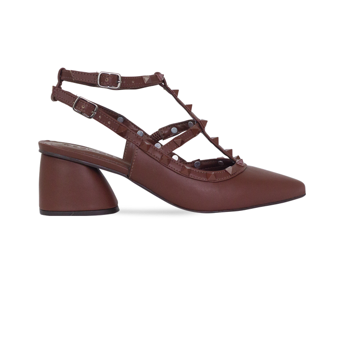 O modelo Mona Low aposta em um visual cheio de personalidade sem abrir mão do conforto. Com salto de 5 cm em formato bloco levemente abaulado, ele garante estabilidade e estilo para o dia a dia. O cabedal de bico fino é cruzado por tiras duplas com aplicações de pirâmides no mesmo tom do sapato, criando um efeito monocromático sofisticado e ao mesmo tempo moderno. A fivela lateral regula o ajuste, enquanto o design aberto no calcanhar traz leveza à composição. Essa proposta remete aos modelos icônicos da Valentino, que seguem firmes entre os favoritos das fashionistas.