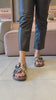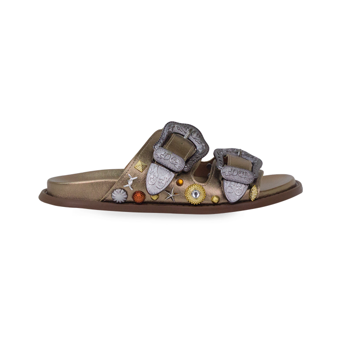 A Raika é aquela papete de impacto que transforma o look sem esforço: toda em couro, inclusive a palmilha, ela vem com duas tiras largas e maxi fivelas trabalhadas, com desenho ornamentado que puxa para o mood western chic. Na lateral, o charme fica por conta do mix de aplicações com efeito joia (medalhas, estrelas e pontos metalizados), criando textura e brilho na medida certa, daqueles que funcionam tanto de dia quanto à noite. O solado baixo e a palmilha macia deixam a pisada mais confortável para acompanhar rotina, viagem, almoço, shopping ou um happy hour, enquanto o visual “statement” entrega a mesma pegada de passarela que a gente vê em referências como Isabel Marant e Chloé (boho com western), além do clima de fivelas marcantes que aparece em coleções de Gucci e Saint Laurent. Para combinar: fica perfeita com jeans reto ou wide leg e camiseta branca, alfaiataria leve (colete + bermuda), vestido midi fluido, saia jeans, conjunto de linho, ou até um vestido mais minimalista para deixar o calçado ser o protagonista.