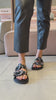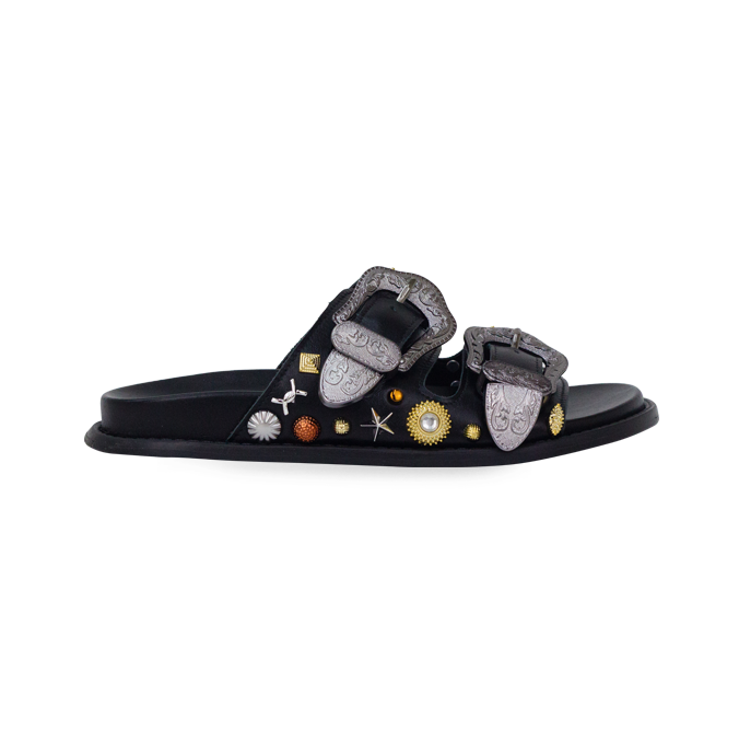 A Raika é aquela papete de impacto que transforma o look sem esforço: toda em couro, inclusive a palmilha, ela vem com duas tiras largas e maxi fivelas trabalhadas, com desenho ornamentado que puxa para o mood western chic. Na lateral, o charme fica por conta do mix de aplicações com efeito joia (medalhas, estrelas e pontos metalizados), criando textura e brilho na medida certa, daqueles que funcionam tanto de dia quanto à noite. O solado baixo e a palmilha macia deixam a pisada mais confortável para acompanhar rotina, viagem, almoço, shopping ou um happy hour, enquanto o visual “statement” entrega a mesma pegada de passarela que a gente vê em referências como Isabel Marant e Chloé (boho com western), além do clima de fivelas marcantes que aparece em coleções de Gucci e Saint Laurent. Para combinar: fica perfeita com jeans reto ou wide leg e camiseta branca, alfaiataria leve (colete + bermuda), vestido midi fluido, saia jeans, conjunto de linho, ou até um vestido mais minimalista para deixar o calçado ser o protagonista.