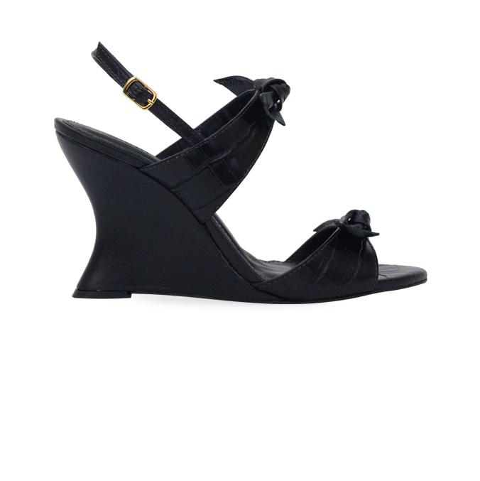 A Sandália Bethania traz aquele impacto imediato de design com o salto anabela escultural de 9 cm, que desenha uma silhueta moderna e ainda entrega mais estabilidade para caminhar do que os saltos finos tradicionais. O modelo tem bico aberto e duas tiras mais largas no peito do pé, cada uma finalizada com laço aplicado, criando um contraste super elegante entre presença e delicadeza; em algumas versões o acabamento aparece com textura marcada tipo croco e em outras mais liso/metalizado, sempre com cara de peça de grife. A tira traseira com fivela regulável ajuda a ajustar no calce e manter o pé firme, e como ela é toda em couro inclusive a palmilha, o toque e a estrutura ficam mais premium para usar por horas. Fica perfeita com alfaiataria (calça reta, pantalona ou bermuda de corte), vestidos midi fluidos, saia acetinada, jeans mais reto com camisa ou até um look minimalista monocromático, e funciona lindo para eventos, jantar, trabalho em dias de reunião e festas onde você quer conforto sem perder o efeito “uau”. Essa combinação de laços + salto escultural conversa direto com o que marcas como Valentino e Miu Miu vêm puxando no lado romântico, enquanto o volume do salto entra na mesma energia das formas escultóricas que aparecem nas coleções de Bottega Veneta e Jacquemus.