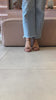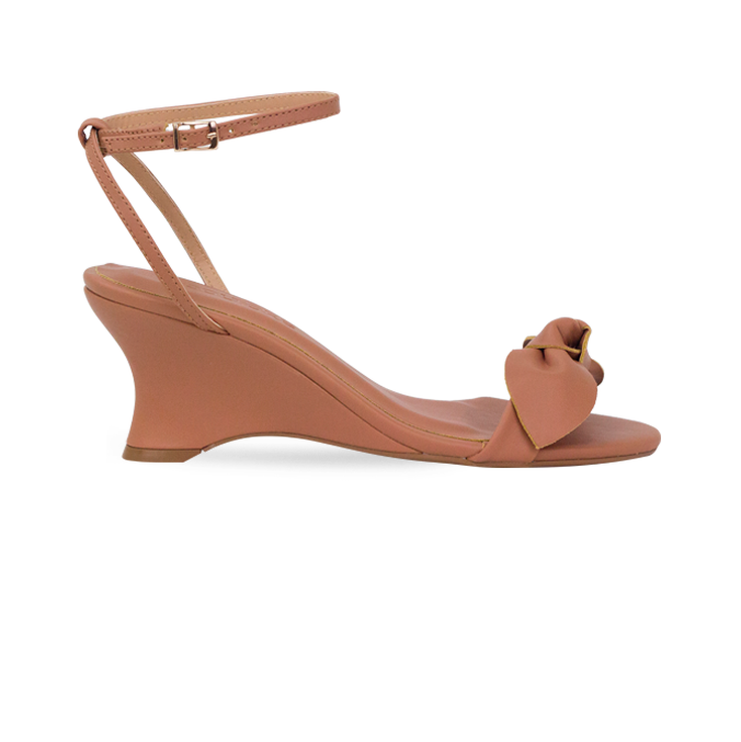 A Sandália Joyce traz salto anabela de 7 cm com desenho escultural, daqueles que entregam altura com mais estabilidade no passo, e uma proposta bem feminina sem ficar óbvia: a tira frontal ganha laço volumoso que vira o ponto de charme do look, enquanto as tiras finas que sobem para o tornozelo, com ajuste por fivela, ajudam a firmar o pé e deixam o peito do pé mais leve visualmente; a base alongada e a frente aberta deixam a produção com cara de verão urbano, funcionando do office ao jantar, e conversa direto com essa onda de minimalismo com detalhe marcante que a gente vê em referências como Bottega Veneta e Ferragamo (formas limpas, salto com presença) e também com o toque romântico atual que marcas como Valentino e Miu Miu colocam nos acessórios; para combinar, vai muito bem com calça de alfaiataria reta ou wide leg, jeans de barra alongada, vestido midi de tecido fluido, saia acetinada ou conjunto de linho, e fica ainda mais interessante quando você brinca com texturas no look já que a Joyce aparece em diferentes versões de acabamento, incluindo opção metalizada.