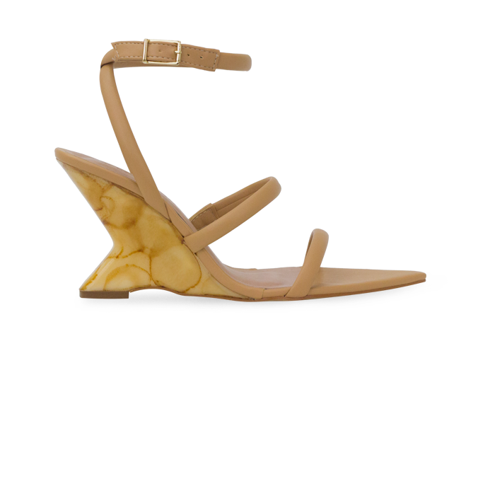 A Sandália Kaia é uma expressão de arte e estilo. Com salto escultural de 9 cm e tiras finas que envolvem o pé com delicadeza, o modelo traduz modernidade e ousadia em cada detalhe. Em algumas versões, o destaque vai para o salto com pintura marmorizada — um efeito artístico que confere textura e personalidade à peça, remetendo às esculturas contemporâneas de Amina Muaddi e às linhas refinadas da Bottega Veneta.