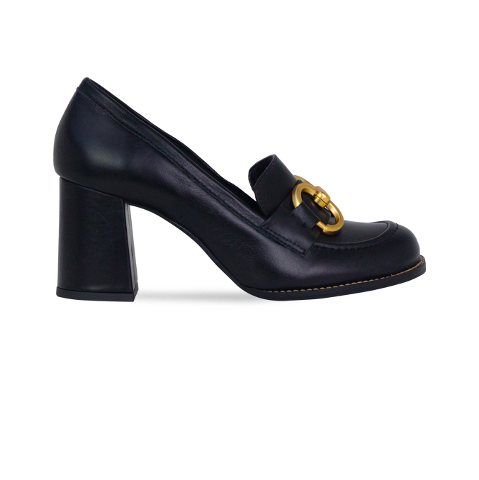 Scarpin Ester Preto em Couro com Bridão Dourado e Salto de 7 cm