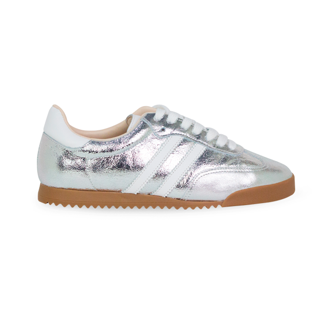 O Tênis Betina aposta no brilho do couro craquelado prata para entregar um visual moderno, urbano e cheio de personalidade. O acabamento metalizado espelhado, com textura sutil, destaca o cabedal inteiro em couro, enquanto o solado caramelo de 1,5 cm traz o contraste perfeito — uma combinação que remete ao estilo retrô esportivo dos anos 70, muito visto nas passarelas de marcas como Loewe e Chloé.
